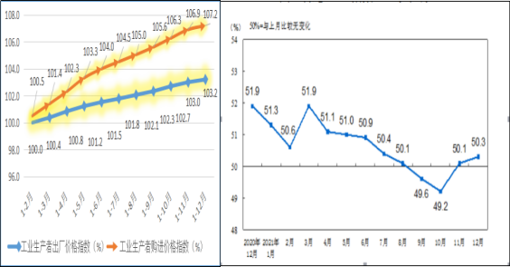 (三)能耗双控、工业生产价格指数(PPI)上涨、制造业采购经理指数(PMI)下降会对我县工业发展造成影响。一是由于我县工业总产值小,对企业能耗指标稀释能力弱,将对我县腾泰矿业、九鑫水泥等高能耗企业稳定生产带来考验。二是2021年重庆工业生产价格指数持续走高,工业生产者购进价格指数从2月100.5%攀升到12月107.2%,工业生产者出厂价格指数从2月100.0%攀升到12月103.2%,工业生产者价格指数上涨表明企业原材料成本增加,给工业经济运行带来了较大的压力。三是制造业PMI指数总体持续走低,即使在10月触底反弹回升,也仍处于50%临界点左右,表明整个制造业经济恢复性发展步伐有待增强,企业对发展预期仍存忧虑。政府宏观政策是经济发展的风向标,PPI、PMI指数是经济变化的晴雨表,我县工业企业数量少、实力不强,承担压力和抗风险能力弱,将对我县工业发展带来较大影响。