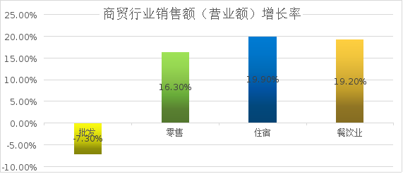 (三)商贸板块多个指标实现新跨越。一季度,批发零售业实现增加值3.33亿元,增长1.9%,拉动经济增长0.1个百分点;住宿餐饮业实现增加值0.92亿元,增长10.4%,拉动经济增长0.2个百分点。实现社会消费品零售总额25.67亿元,增长9.9%。商贸4个行业中零售业、住宿业、餐饮业商品销售额(营业额)增速有效填补了我县批发业对GDP增长的负拉动。批发、零售、住宿、餐饮业销售额(营业额)分别增长-7.3%、16.3%、19.9%、19.2%。